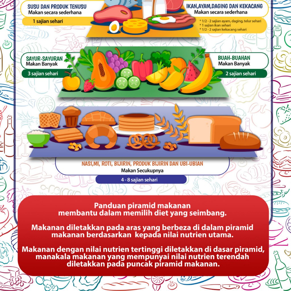 Piramid makanan merupakan satu panduan pemakanan umum bagi orang ramai. Piramid makanan malaysia merupakan satu panduan mudah bagi individu. Piramid makanan mengandungi beberapa bahagian makanan yang biasanya dikategorikan mengikut kesamaan. Untuk edisi infografik kali ini kita akan melihat panduan pemakanan terbaik melalui piramid makanan. Berapakah kumpulan makanan terdapat dalam piramid makanan? Piramid makanan direka untuk menjadikan satu rujukan makanan yang sihat lebih mudah bagi semua orang. Piramid makanan malaysia mp3 download gratis mudah dan cepat di metrolagu, stafaband, downloadlagu321. Panduan makanan seimbang perlu tahu,piramid kiosk kesihatan anda: Piramid makanan malaysia merupakan satu panduan mudah bagi individu. Selain itu, rakyat yang mengikuti piramid makanan untuk mendapatkan nutrien yang diperlukan setiap hari. Ia menggariskan jenis dan jumlah makanan yang harus diambil. Mempelbagaikan makanan harian mengikut jumlah sajian yang disarankan. Panduan ini telah dihasilkan oleh kementerian kesihatan malaysia.