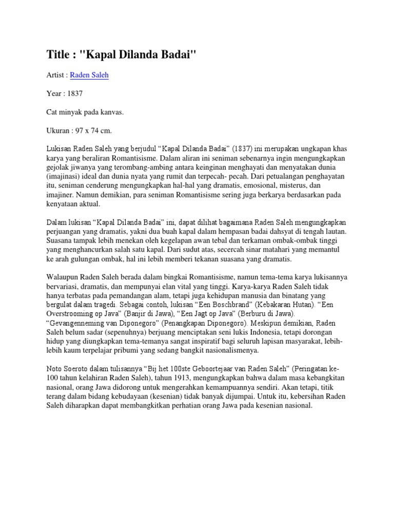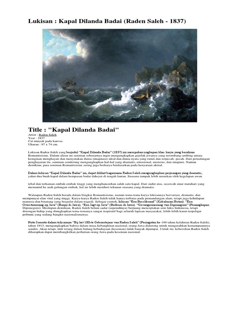 Agar menghasilkan sapuan yang tipis dan ringan, alangkah baiknya kamu menggunakan cat yang sedikit encer. Dalam lukisan kapal dilanda badai, dapat dilihat bagaimana raden saleh mengungkapkan perjuangan dramatis dua buah kapal dalam hempasan badai dahsyat di tengah lautan. Contohnya seperti lukisan berjudul kapal dilanda badai karya raden saleh berikut ini. Dance at bougival karya renoir. Menganalisis karya seni rupa lukisan.